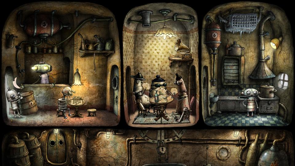 就在这么一个小小的机器城堡里,有共同音乐爱好走到一起的机器乐队,有苦心钻研五子棋的饭店老板,童心未泯的大块头警卫,一对胖瘦好基友。当然最可爱的是我们的呆萌主角机器人,一举一动都透露着喜感。肩负着拯救公主教训坏蛋重任的它,不仅战斗力差,还兼有多动症、幻想症的毛病,经常弄坏公共财物、乱扔东西。无论主角配角,他们一个个都是机械迷城里不可或缺的一部分,共同组成了这个有趣可爱的机械乌托邦。
